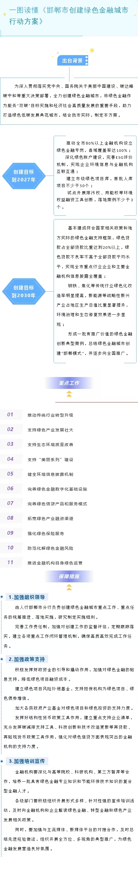 到2030年,基本建成符合国家相关政策和地方实际的绿色金融支持框架,绿色贷款占全部贷款比重达到20%以上,绿色贷款不良率不高于全部贷款平均水平,实现全市重点行业企业和主要金融机构信息披露全覆盖;钢铁、焦化等传统行业绿色化改造率明显提高,新能源等战略性新兴产业占地区生产总值比重显著提升,环境治理和生态修复效果进一步显现;形成一批有推广价值的绿色金融创新典型案例,总结绿色金融城市创建“邯郸模式”,并逐步向全国推广。