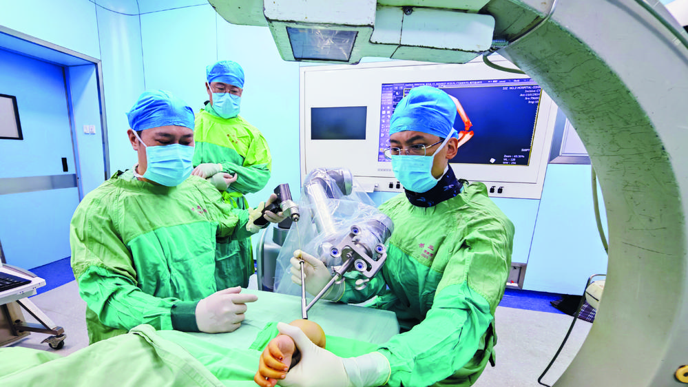 在石家庄市第三医院,在骨科手术机器人的辅助下,医生正在为患者实施微创手术。