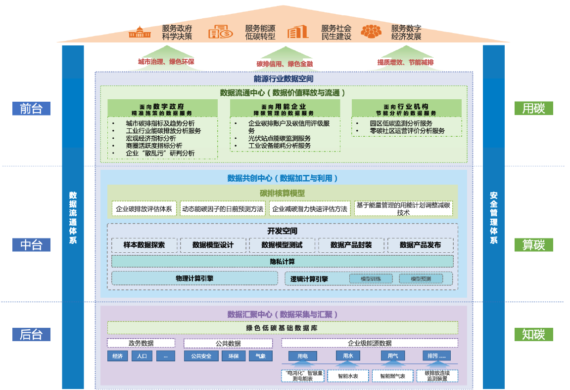 实现“双碳”目标,能源是主战场,电水气是主力军,数据要素是关键。当前,能源各领域企业积累了良好的数据基础,并开展了碳相关计算及应用尝试,但跨领域数据复用、融合、协同性不足,碳排核算和预测精准度有待提高,高价值碳应用仍较稀缺。如何利用多方数据计算实现“全面知碳、精准算碳、高效用碳”是当前绿色低碳发展的关键挑战。广东电网有限责任公司建设能源行业数据空间,打造数据要素基础设施,推动能源数据复用、融合、协同,打造“知算用”一体的碳数据服务体系,推动碳的全面洞察、精确核算、价值利用,赋能政府高效治理、行业提质增效、企业节能降碳。