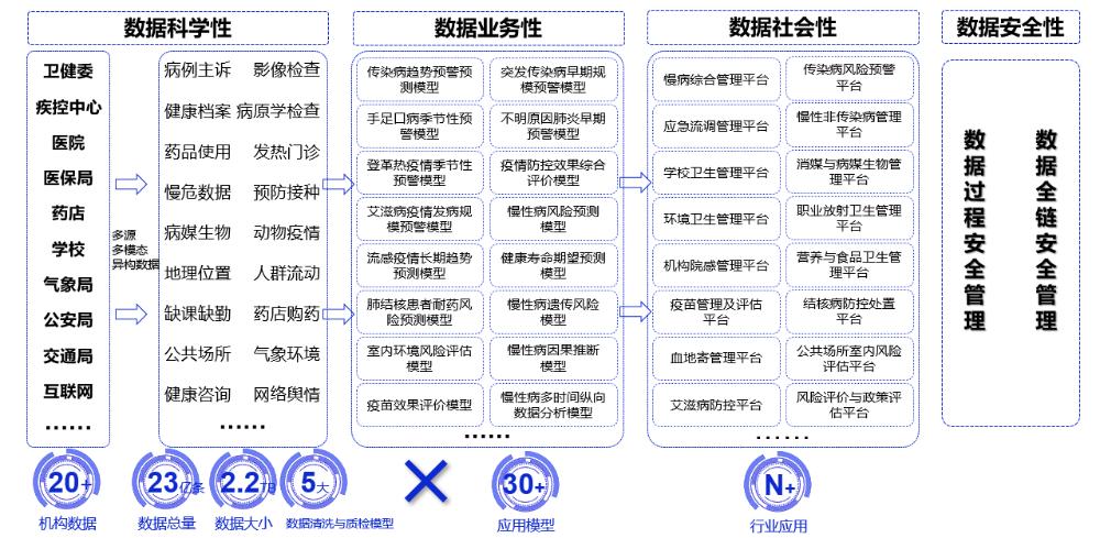 一是融合多源多模态异构数据。深度整合来自疾控中心、卫健委、医疗机构及卫生监督机构等超过20家单位的多源多模态异构数据资源,包括健康档案、病媒生物监测、公共场所卫生状况等30多类数据。通过运用先进的数据清洗与质量控制模型,形成包括传染病发病趋势预警、慢性病风险预测、室内环境风险评估在内的30余种应用模型。
